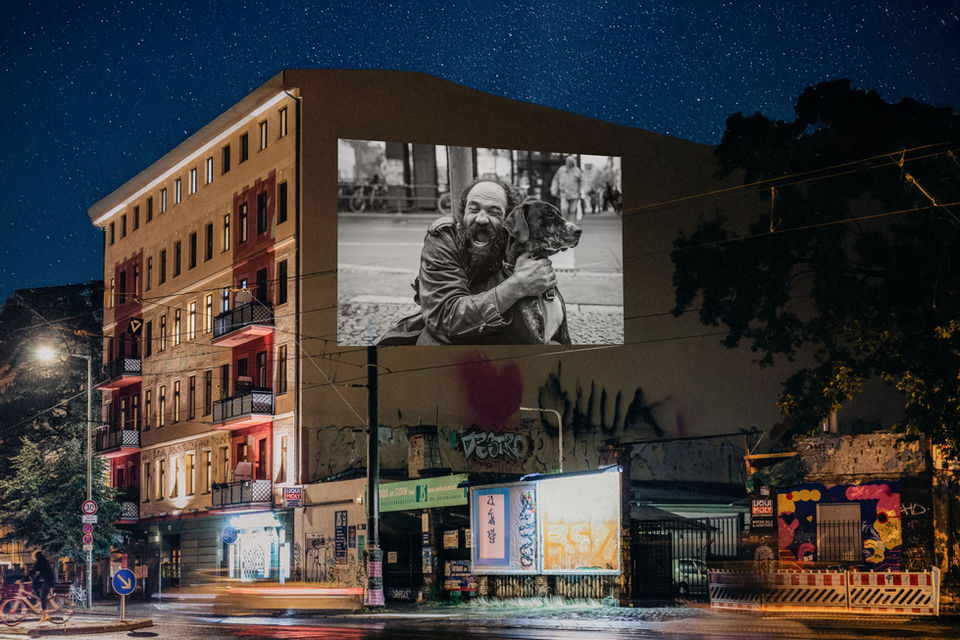 Willy-Brandt-Haus zu sehen. Die Portraits der "KEIN RAUM – Begegnungen mit Menschen ohne Obdach" Serie wurden im Rahmen des Festival of Lights 2024 an Berliner Gebäudefassaden projiziert.